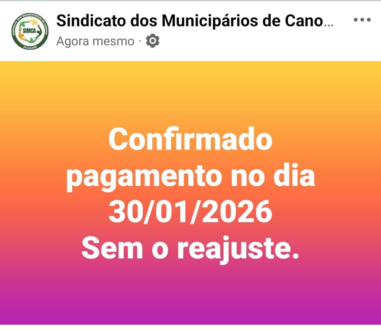 Confirmado pagamento no dia 30/01/2026 (SEM O REAJUSTE).